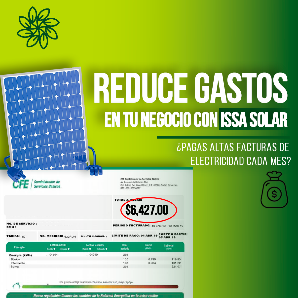 Transforma tu negocio con nuestras soluciones solares. ISSA Solar instala paneles solares que te ayudan a reducir costos operativos y mejorar tu sostenibilidad. Aumenta la eficiencia energética de tu empresa mientras cuidas el medio ambiente.